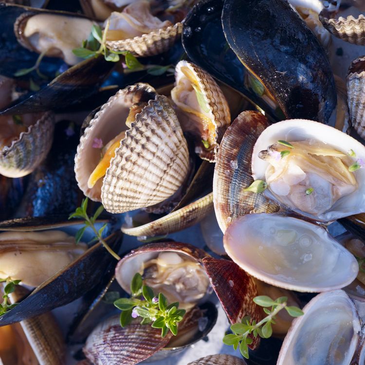 Zu saftigen Miesmuscheln serviert Dominik Vombach…