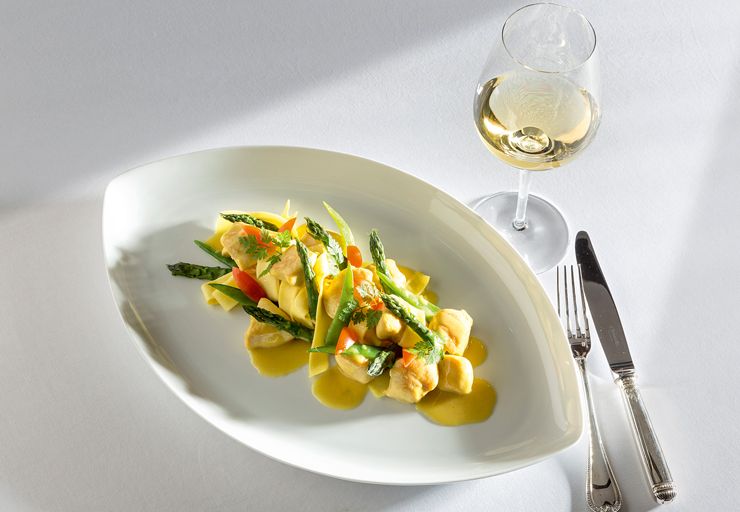 Nicht ganz so klassisch, aber eine wunderbare Abwechslung auf dem Spargelteller ist leicht sahnige Estragonsauce, in der wir frischen Lachs in grossen Würfeln garziehen lassen. Im Glas dazu die feinfl orale Nussigkeit eines Weissburgunders aus einer warmen vulkanischen Ecke wie dem Kaiserstuhl. Noch unklassischer dann ein Salat aus rohem weissem Spargel in dünnen schrägen Scheiben, mit bestem raubenkernöl, mildem Weissweinessig, einer Idee scharfem Senf, Orangenzeste und viel frischem Kerbel angemacht, gerne auch auf einem Rindercarpaccio, zu würzig lebendigem Grillo vom Ätna.