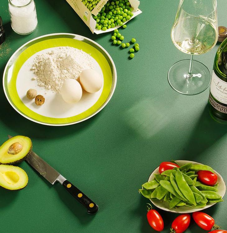 Dann ist es an der Zeit, auch die kräftige Seite der grünen Prinzessin zu erkunden. Wir kochen Tagliatelle und Erbsen und verbinden beides mit Rucola-Pesto – und siehe da, unsere grüne Holde ist Rotwein keineswegs abgeneigt! Gereifter, reifer Spätburgunder aus einer warmen Ecke wie dem Kaiserstuhl verleiht der Begegnung elegante Gravitas. Betten wir die Erbsen hingegen mit Kräutern, Ei und Ziegenkäse in eine Quiche, dann gefällt uns dazu weisser, kräftiger Wein wie der Saint-Chinian Montmajou von Les Eminades aus Grenache und etwas Marsanne. Der sich wiederum in seiner mineralisch-erdigen Art auch gut mit Spätzle verträgt, die wir ungewöhnlicherweise mit grünem Spargel, Morcheln und viel Erbsen anschwenken und mit Butter abrunden. Auch eher ungewöhnlich: eine junge Ente, angebraten und im eigenen Fonds im Ganzen gegart. Gegen Ende geben wir Erbsen und grünen Salat in groben Streifen zu, reduzieren dann den Fonds und legieren ihn mit Sahne und Eigelb zur Sauce. Schliesslich: Fleisch tranchieren, Gemüse dazu, Sauce darüber. Löffel nicht vergessen! Und den Wein: gereifter, grosser Riesling wie vor kurzem ein zwölf Jahre alter Ölberg von St. Antony vom rheinhessischen Rhein. Sonntagstauglich, schmeckt aber auch an anderen Wochentagen.