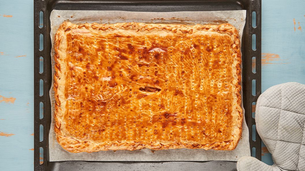 4. Mit der zweiten Teigplatte verschliessen, mit Ei bestreichen, backen.