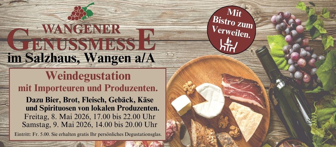 Gönnen Sie sich Genuss! Im Salzhaus lädt ein breites kulinarischens Angebot zum Verweilen und Geniessen ein. Zum Beispiel Weine und Bier zum Degustieren, lokale Produkte wie Käse, frisches Brot und Gebäck und Fleisch sowie ein gemütliches Bistro. Der Treffpunkt für GeniesserInnen im Mai in Wangen an der Aare.