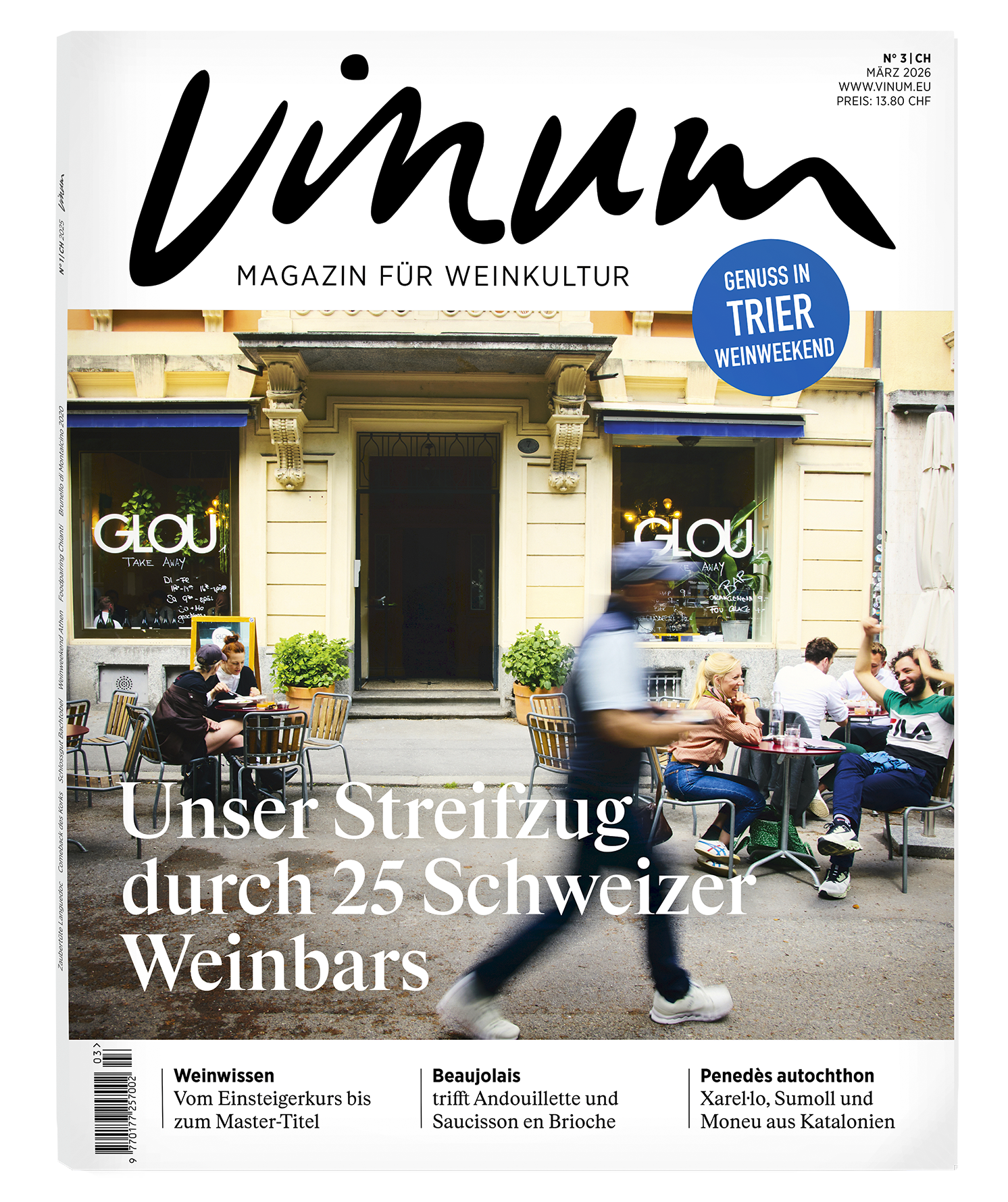 Einzelausgabe Aktuelle VINUM Ausgabe jetzt bestellen für 13.80 Franken (zzgl. 4 Franken Versandkosten) Bestellen Sie sich die aktuelle Ausgabe bequem zu Ihnen nach Hause und tauchen Sie ein in die faszinierende Welt des Weins. (Nur für Lieferungen innerhalb CH & LI erhältlich) Bester Weinjournalismus | Unabhängige Bewertungen | Mitreissenden Reportagen | Fundiertes Wissen | Reisetipps & Foodpairings Freuen Sie sich auf:Spannenden WeinjournalismusUnabhängige BewertungenMitreissende ReportagenFundiertes WissenKöstliche FoodpairingsInspirierende ReisetippsHighlights in der aktuellen Ausgabe:Reportage Schweiz: 25 Weinbars fühlen den ZeitgeistWeinwissen: Vom Einsteigerkurs bis zum Master-TitelRoadshow Neuchâtel 2026: Spezialitäten würdigenWeinweekend: Genuss in TrierWinzerlegende: Anselmo Mendes, Vinho VerdeIstrien: Mit Malvazija und Teran an die SpitzeSommelier’s Choice: Das Beste zu: KaiserschmarrnMarktschau: Riesling trocken unter 30 FrankenFoodpairing: BeaujolaisLesen Sie ausserdem über neue Trends, inspirierende Winzerporträts und aktuelle Empfehlungen für genussvolle Momente. Sie wollen VINUM kennenlernen? Hier gehts zum VINUM Probeabo - 3 VINUM Ausgaben für nur 20 Franken! Angebot gültig solange Vorrat. Rechnungsanschrift Firmenname Anrede* Herr Frau Titel Nachname* Vorname* Strasse/Nr.* PLZ* Ort* Land* Schweiz Liechtenstein Geburtsdatum* E-Mail* Telefon Mobil Abweichende Lieferadresse Lieferanschrift Firmenname Anrede* Herr Frau Titel Nachname* Vorname* Strasse/Nr.* PLZ* Ort* Land* Schweiz Liechtenstein Telefon E-Mail Mobil Zahlungsinformationen Rechnung Kontoinhaber IBAN* BIC* SEPA-Lastschriftmandat: Ich ermächtige den Verlag Zahlungen von meinem Konto mittels Lastschrift einzuziehen. Zugleich weise ich mein Kreditinstitut an, die vom Verlag auf mein Konto gezogenen Lastschriften einzulösen. Hinweis: Ich kann innerhalb von acht Wochen, beginnend mit dem Belastungsdatum, die Erstattung des belasteten Betrages verlangen. Es gelten dabei die mit meinem Kreditinstitut vereinbarten Bedingungen. Zahlungsrythmus: jährlich Ihre Mitteilung an uns Ja, ich will von weiteren Vorteilen profitieren und bin damit einverstanden, dass ich unverbindliche Angebote des Verlags Intervinum AG zu Abonnements, Büchern, Accessoires, Online-Produkten, Veranstaltungen und dem Wine Trade Club per E-Mail übermittelt bekomme. Mein Einverständnis hierzu kann ich jederzeit widerrufen (z. B. per E-Mail an info@vinum.ch). Zudem nehme ich zur Kenntnis, dass damit Daten von mir gespeichert werden und akzeptiere die Datenschutzbestimmungen. Ja, ich akzeptiere die Allgemeinen Geschäftsbedingungen.* Ich bin mehr als 18 Jahre alt* Mit der Anmeldung werden die Daten aus der Eingabemaske an uns übermittelt. Zudem werden die IP-Adresse des Nutzers sowie Datum und Uhrzeit der Anmeldung gespeichert. Für weitere Informationen verweisen wir auf unsere Datenschutzerklärung. kaufen Mit * markierte Felder sind Pflichtfelder