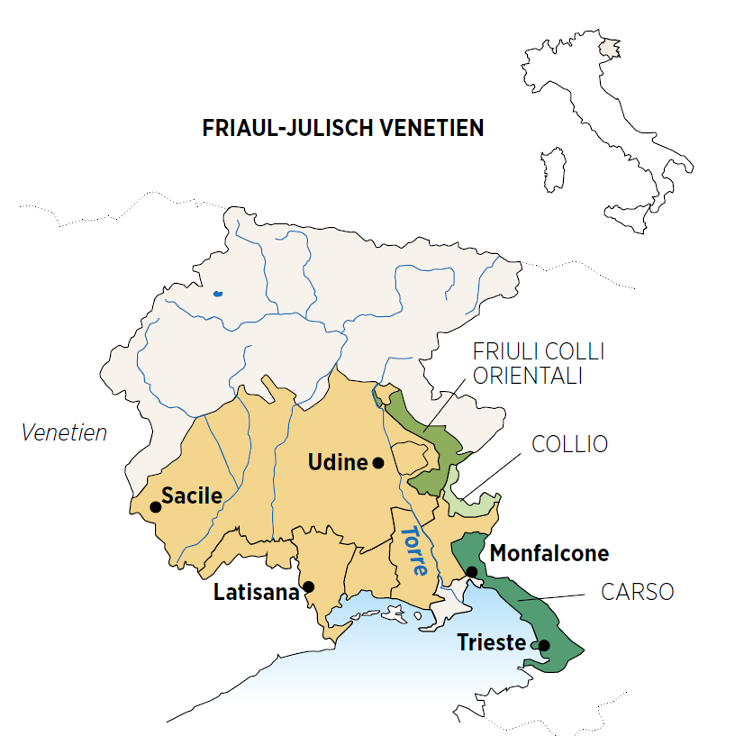 Hier und nirgendo sonst in Italien trifft so viel aufeinander: Friaul-Julisch Venetien ist eine Region, die von vielen Einflüssen lebt. Der Nordosten Italiens grenzt an Österreich und Slowenien, und das ist nicht zu übersehen. Die friulanische Gastfreundschaft und Tradition trifft hier auf eine mitteleuropäische Esskultur. Die Strassenschilder tragen slowenische Untertitel, Nachnamen klingen mal italienisch, mal deutsch, mal slawisch. An manchen Stellen, etwa in der Grenzstadt Gorizia – die Europäische Kulturhauptstadt 2025 zusammen mit Nova Gorizia auf der slowenischen Seite – bemerkt man kaum, wenn man eine Landesgrenze übertritt.