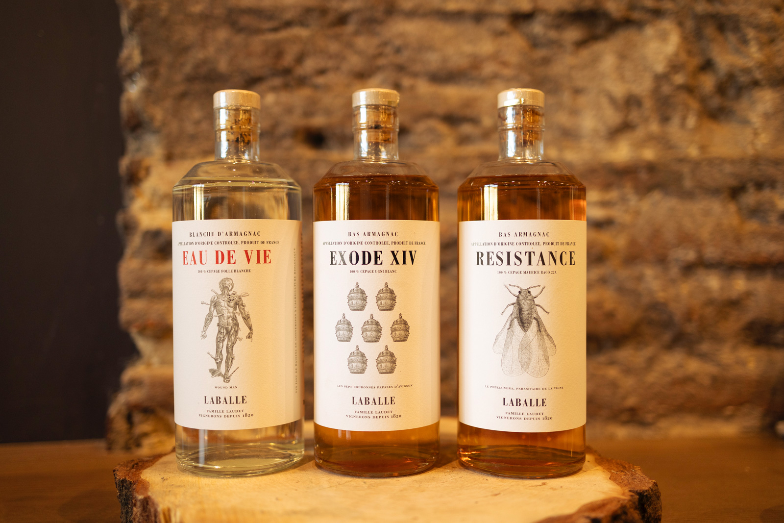 Im Jahr 2022 erfolgte die Umstellung auf bio. «Ich will das Bestmögliche für meine Kinder hinterlassen», begründet Laudet die Umstellung. Gleichzeitig geht er einen Schritt weiter als die Biovorgaben. Mit Beratung von Agroforst-Pionier Alain Canet, der keine 30 Kilometer von der Domaine Laballe entfernt wohnt, hat Laudet rund 5000 Bäume in und um seine Reben gepflanzt, die dem Klimawandel trotzen sollen: Kirsch-, Feigen- und Apfelbäume sowie Ahornbäume, Pinien, Eichen und Eschen. Die Blanche Eau de Vie aus 100 Prozent Folle Blanche ist das erste biozertifizierte Produkt. Zwei weitere sortenreine Armagnacs ergänzen das Sortiment: Das Etikett von Exode XIV aus Ugni Blanc zeigt die sieben Kronen der Päpste Avignons, die im 13. Jahrhundert die Traubensorte aus Italien mitgebracht haben. Eine Reblaus ziert Resistance, destilliert aus der Sorte Maurice Baco 22A. Benannt ist sie nach dem Sohn ihres Erfinders François Baco. Baco ist eine Kreuzung aus Folle Blanche und der amerikanischen Sorte Noah und ist – ohne amerikanische Unterlage – immun gegen Phylloxera.