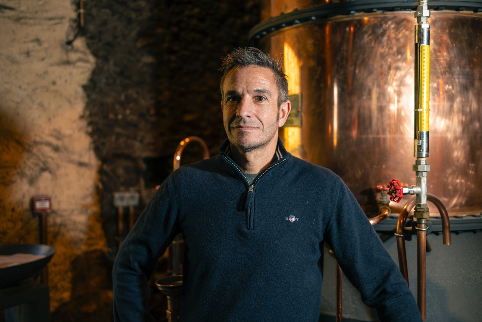 Das Feuer und der Zufluss des Weines sind die zwei Hebel, mit denen Brenner Marcelo Lino und seine Kollegen den Alambic, Baujahr 1983, steuern. Sie orientieren sich dabei an der Geschwindigkeit und dem Alkoholgehalt, mit dem das Destillat aus dem Kondensator fliesst, sowie den Thermometern, die an verschiedenen Stellen angebracht sind. Nach zehn Tagen wird der Prozess unterbrochen, um die Apparatur zu reinigen.