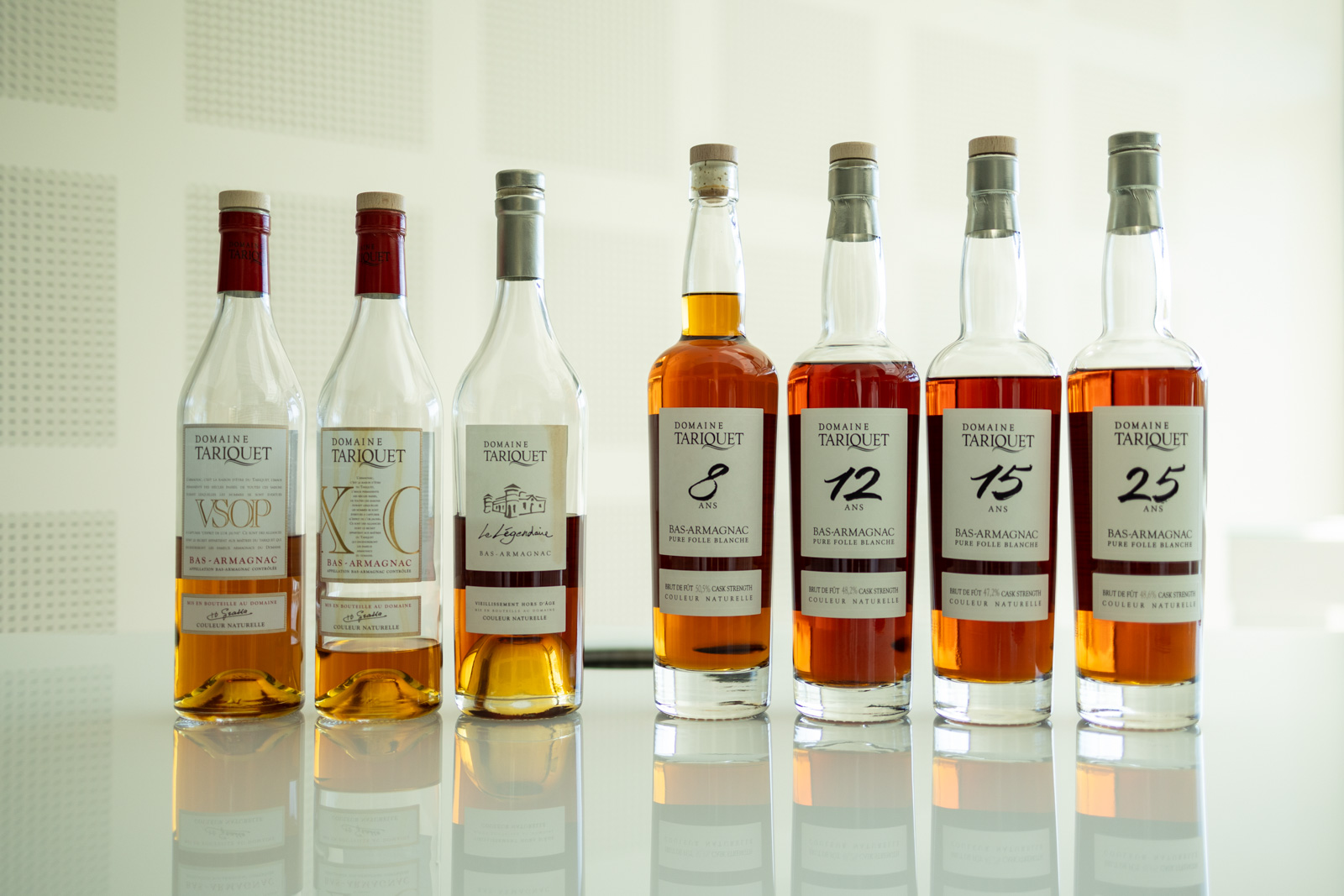 Für die Armagnacs setzt Tariquet bei der Tradition Linie mit VS, VSOP, XO und Hors d’Age auf 60 Prozent Ugni Blanc und 40 Prozent Baco. Spannend sind auch die sortenreinen Armagnacs: Ugni Blanc (10 Jahre), Baco (20 Jahre) und Plant de Graisse (18 Jahre). Eine Sonderstellung im Portfolio geniesst die Sorte Folle Blanche. Die Entwicklung der Fasslagerung lässt sich bei dieser Rebsorte von der «Blanche» über VS, 8, 12, 15 und 25 Jahre degustieren. Bei den Raritäten finden sich Jahrgangsabfüllungen sowie der Montreur d’Ours, der Bärentreiber. Der Name dieser Cuvée aus Eaux de Vie aus Plant de Graisse, Ugni Blanc und Baco, die zwischen 10 und 20 Jahre gelagert wurden, bezieht sich auf die Tätigkeit der Familie Artaud. Diese reiste im 19. Jahrhundert mit ihren Bären erst nach England, später in die USA, ehe sich ein Zweig der Familie 1912 wieder in der Gascogne niederliess und die Domaine mit damals erst sieben Hektar Land übernahm.