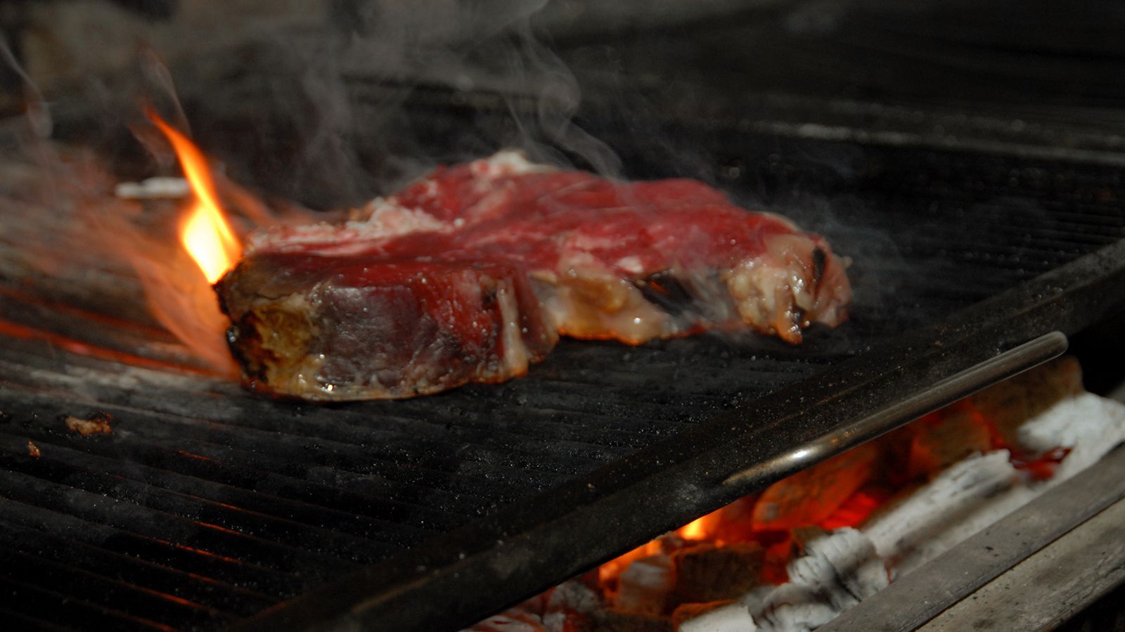 3. Genügend Rebholz abbrennen, bis keine Flamme mehr aufflackert und eine sehr heisse Glut entsteht. Fleisch rasch auf einer Seite braun grillieren, erst dann wenden und die zweite Seite grillieren. Diese braucht etwas länger, weil die Glut rasch zusammenfällt. Vom Feuer nehmen und auf ein Kuchenblech geben,