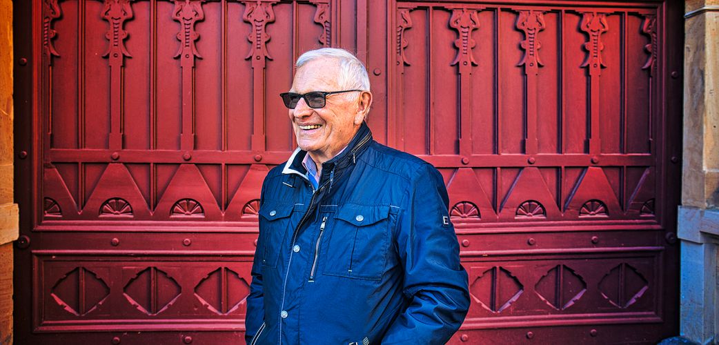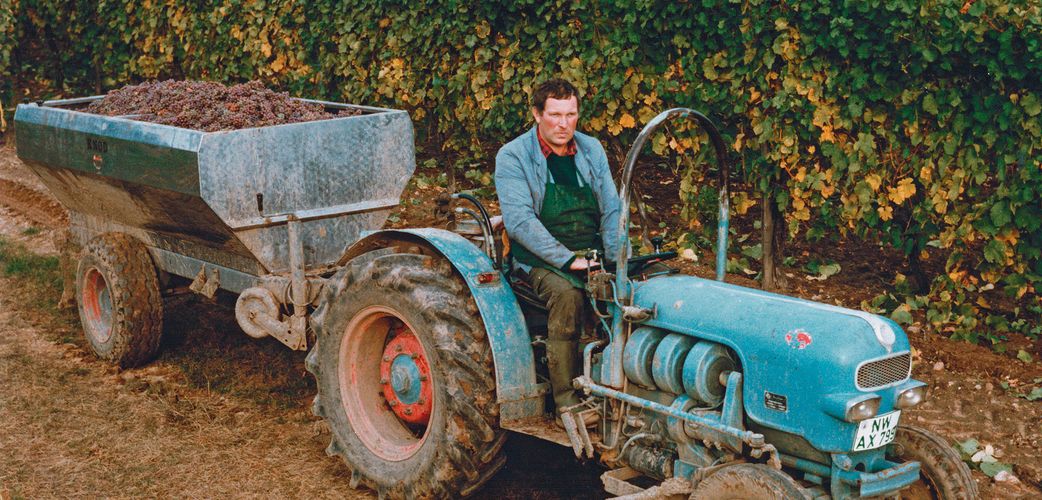 Hans-Günter nach der Ernte von gesunden Trauben auf dem Weg in den Betrieb