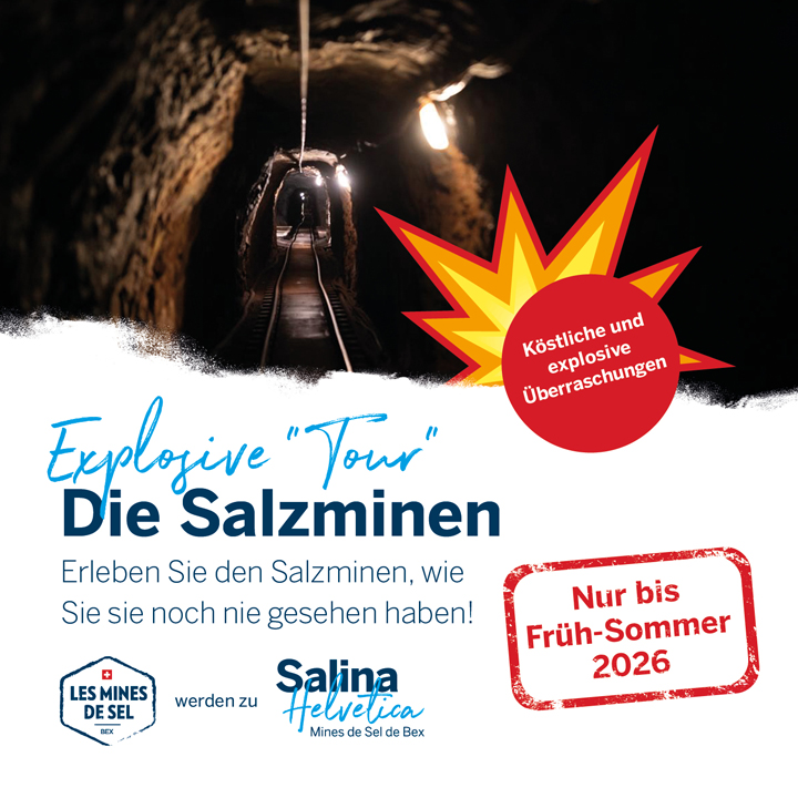 In den alten Salzminen von Bex lernen Sie, wie vor abertausenden von Jahren das Salz in den Berg gekommen ist und wie Bergleute der Region seit rund 500 Jahren das kostbare Gut aus dem Berg holen. Der aktuell geführte Rundgang misst einen Kilometer und trägt den verheissungsvollen Titel «Die explosive Tour». Erleben Sie hautnah, wie sich die Technik des Salzabbaus in den letzten Jahrhunderten entwickelt hat. Zum Abschluss gibt es eine süsse und salzige kulinarische Überraschung. Für Abenteurer bietet sich der neue TrekkMines-Rundgang an. Steigen Sie die 804 Stufen hoch in den Berg bis zum historischen Stollen aus dem 18. Jahrhundert. Während der 3½ Stunden legen Sie drei Kilometer und 180 Höhenmeter zurück.