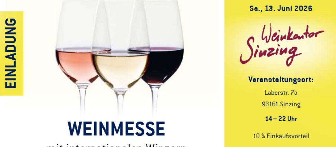 Gemeinsam mit Ihnen möchten wir unsere Leidenschaft für Wein feiern, spannende Begegnungen ermöglichen und Ihnen eine vielfältige Auswahl großartiger Weine präsentieren.Folgende Weingüter haben bereits Ihre Teilnahme zugesagt:- Cantina Albino Armani,Venetien-Trentino- Weingut Bauer, Weinviertel- Champagne Konrat, Champagne- Feudo di Santa Tresa, Sizilien - BIO- Weingut Hemer, Rheinhessen - BIO- Weingut Kiefer & Schmidt, Baden - BIO- Respizhof Kölbl, Weinviertel- Weingut Lucashof, Pfalz - BIO- MAD-Haus Marienberg, Burgenland- Mas des Bressades, Rhône - BIO- Weingut Nigl, Kremstal- Weingut Rings, Pfalz - BIO- Carlo Sani, Apulien- Tenuta Santa Caterina, Piemont- Weingut Schloss Sommerhausen, Franken - BIO- Weingut Schmitges, Mosel- Weingut Schmitt, Rheinhessen- The Wine People, Sizilien- Weingut Wimmer-Czerny, Wagram - BIO- WG Durbach, Baden- Weingut Zahel, Wien - BIO Mit dabei: - Live-Musik und DJ - Kulinarik - Riemhofer Catering, Regensburg und KäseWiese, Regensburg- Eintrittspreis 25,- € - 10 % EinkaufsvorteilWir freuen uns auf Ihren Besuch!Anmeldungen wünschenswert an info@weinkontor-sinzing.de oder Tel. 0941 3075755