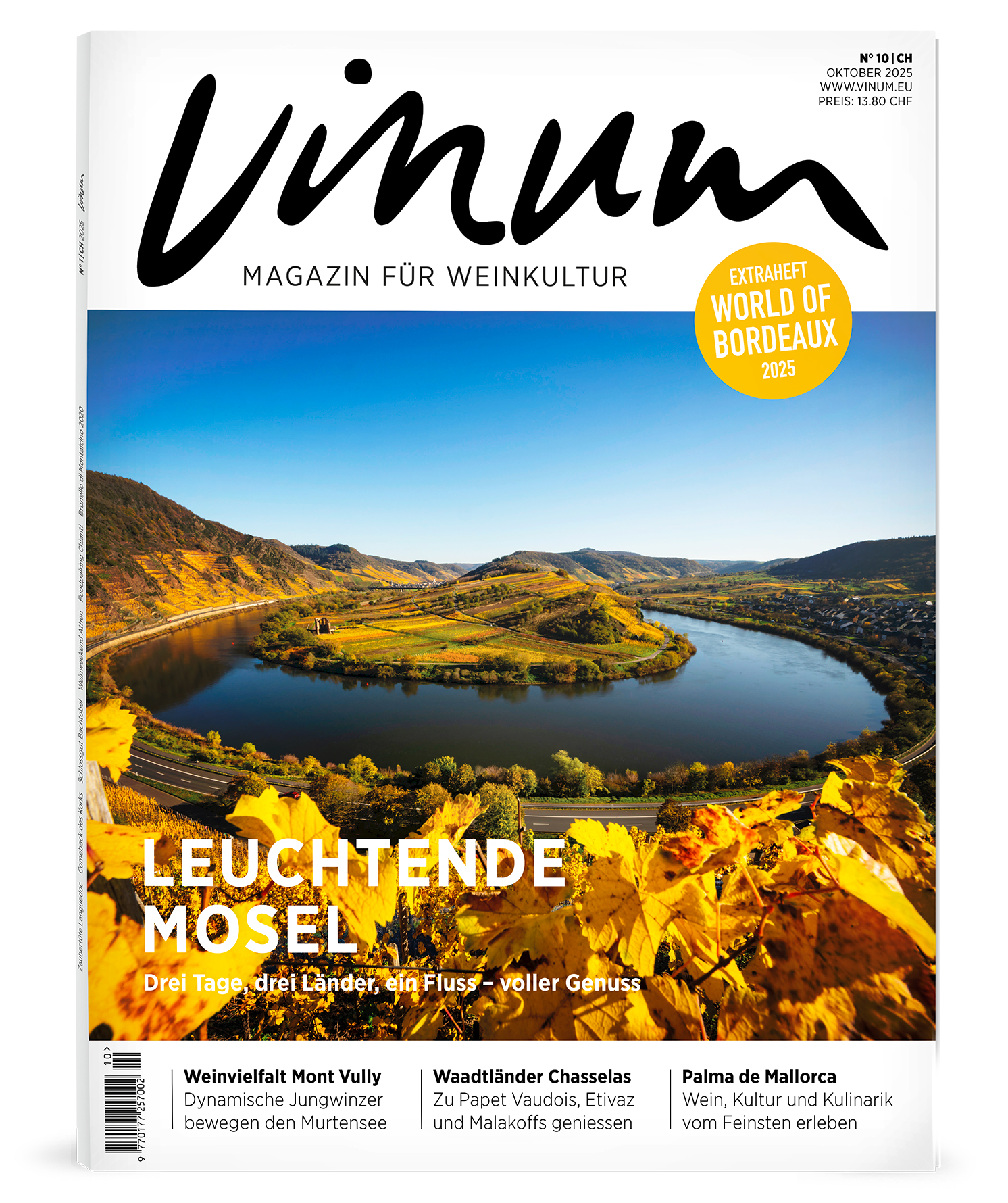 Einzelausgabe Aktuelle VINUM Ausgabe jetzt bestellen für 13.80 Franken (zzgl. 4 Franken Versandkosten) Bestellen Sie sich die aktuelle Ausgabe bequem zu Ihnen nach Hause und tauchen Sie ein in die faszinierende Welt des Weins. (Nur für Lieferungen innerhalb CH & LI erhältlich) Bester Weinjournalismus | Unabhängige Bewertungen | Mitreissenden Reportagen | Fundiertes Wissen | Reisetipps & Foodpairings Freuen Sie sich auf: Spannenden Weinjournalismus Unabhängige Bewertungen Mitreissende Reportagen Fundiertes Wissen Köstliche Foodpairings Inspirierende Reisetipps Highlights in der aktuellen Ausgabe: Extraheft: World of Bordeaux 2025 Rhône im Fokus: Weinvielfalt aus der AOC Ventoux Winzerlegende: Christine Vernay, Rhone Palma de Mallorca: Wein, Kultur und Kulinarik vom Feinsten erleben Weinvielfalt Mont Vully : Dynamische Jungwinzer bewegen den Murtensee Wadtländer Chasselas: Zu Papet Vaudois, Etivaz und Malakoffs geniessen Best of Steiermark 2025: VINUM Wine Competition Foodpairing: Waadt Lesen Sie ausserdem über neue Trends, inspirierende Winzerporträts und aktuelle Empfehlungen für genussvolle Momente. Sie wollen VINUM kennenlernen? Hier gehts zum VINUM Probeabo - 3 VINUM Ausgaben für nur 20 Franken! Angebot gültig solange Vorrat. Rechnungsanschrift Firmenname Anrede* Herr Frau Titel Nachname* Vorname* Strasse/Nr.* PLZ* Ort* Land* Deutschland Geburtsdatum* E-Mail* Telefon Mobil Abweichende Lieferadresse Lieferanschrift Firmenname Anrede* Herr Frau Titel Nachname* Vorname* Strasse/Nr.* PLZ* Ort* Land* Deutschland Telefon E-Mail Mobil Zahlungsinformationen Rechnung Bankeinzug Kontoinhaber IBAN* BIC* SEPA-Lastschriftmandat: Ich ermächtige den Verlag Zahlungen von meinem Konto mittels Lastschrift einzuziehen. Zugleich weise ich mein Kreditinstitut an, die vom Verlag auf mein Konto gezogenen Lastschriften einzulösen. Hinweis: Ich kann innerhalb von acht Wochen, beginnend mit dem Belastungsdatum, die Erstattung des belasteten Betrages verlangen. Es gelten dabei die mit meinem Kreditinstitut vereinbarten Bedingungen. Zahlungsrythmus: jährlich Ihre Mitteilung an uns Ja, ich will von weiteren Vorteilen profitieren und bin damit einverstanden, dass ich unverbindliche Angebote des Verlags Intervinum AG zu Abonnements, Büchern, Accessoires, Online-Produkten, Veranstaltungen und dem Wine Trade Club per E-Mail übermittelt bekomme. Mein Einverständnis hierzu kann ich jederzeit widerrufen (z. B. per E-Mail an info@vinum.ch). Zudem nehme ich zur Kenntnis, dass damit Daten von mir gespeichert werden und akzeptiere die Datenschutzbestimmungen. Ja, ich akzeptiere die Allgemeinen Geschäftsbedingungen und Hinweise zum Widerrufsrecht.* Ich bin mehr als 18 Jahre alt* Mit der Anmeldung werden die Daten aus der Eingabemaske an uns übermittelt. Zudem werden die IP-Adresse des Nutzers sowie Datum und Uhrzeit der Anmeldung gespeichert. Für weitere Informationen verweisen wir auf unsere Datenschutzerklärung. kaufen Mit * markierte Felder sind Pflichtfelder