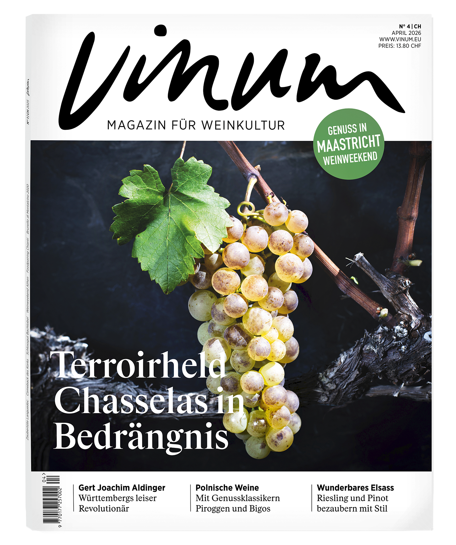 Einzelausgabe Aktuelle VINUM Ausgabe jetzt bestellen für 13.80 Franken (zzgl. 4 Franken Versandkosten) Bestellen Sie sich die aktuelle Ausgabe bequem zu Ihnen nach Hause und tauchen Sie ein in die faszinierende Welt des Weins. (Nur für Lieferungen innerhalb CH & LI erhältlich) Bester Weinjournalismus | Unabhängige Bewertungen | Mitreissenden Reportagen | Fundiertes Wissen | Reisetipps & Foodpairings Freuen Sie sich auf:Spannenden WeinjournalismusUnabhängige BewertungenMitreissende ReportagenFundiertes WissenKöstliche FoodpairingsInspirierende ReisetippsHighlights in der aktuellen Ausgabe:Reportage Schweiz: Chasselas auf dem PrüfstandWeinweekend: Genuss in MaastrichtWunderbares Elsass: Riesling und Pinot bezaubern mit StilFoodpairing: Polnische Weine mit Genussklassikern Piroggen und BigosReportage international: Griechenlands Weinwunderim AufbruchWinzerlegende: Gert Joachim Aldinger, WürttembergInterview: Christine Müller, Kloster EberbachSelektion Bolgheri DOC: Weine aus LichtSommelier’s Choice: Salade NiçoiseLesen Sie ausserdem über neue Trends, inspirierende Winzerporträts und aktuelle Empfehlungen für genussvolle Momente. Sie wollen VINUM kennenlernen? Hier gehts zum VINUM Probeabo - 3 VINUM Ausgaben für nur 20 Franken! Angebot gültig solange Vorrat. Rechnungsanschrift Firmenname Anrede* Herr Frau Titel Nachname* Vorname* Strasse/Nr.* PLZ* Ort* Land* Deutschland Geburtsdatum* E-Mail* Telefon Mobil Abweichende Lieferadresse Lieferanschrift Firmenname Anrede* Herr Frau Titel Nachname* Vorname* Strasse/Nr.* PLZ* Ort* Land* Deutschland Telefon E-Mail Mobil Zahlungsinformationen Rechnung Bankeinzug Kontoinhaber IBAN* BIC* SEPA-Lastschriftmandat: Ich ermächtige den Verlag Zahlungen von meinem Konto mittels Lastschrift einzuziehen. Zugleich weise ich mein Kreditinstitut an, die vom Verlag auf mein Konto gezogenen Lastschriften einzulösen. Hinweis: Ich kann innerhalb von acht Wochen, beginnend mit dem Belastungsdatum, die Erstattung des belasteten Betrages verlangen. Es gelten dabei die mit meinem Kreditinstitut vereinbarten Bedingungen. Zahlungsrythmus: jährlich Ihre Mitteilung an uns Ja, ich will von weiteren Vorteilen profitieren und bin damit einverstanden, dass ich unverbindliche Angebote des Verlags Intervinum AG zu Abonnements, Büchern, Accessoires, Online-Produkten, Veranstaltungen und dem Wine Trade Club per E-Mail übermittelt bekomme. Mein Einverständnis hierzu kann ich jederzeit widerrufen (z. B. per E-Mail an info@vinum.ch). Zudem nehme ich zur Kenntnis, dass damit Daten von mir gespeichert werden und akzeptiere die Datenschutzbestimmungen. Ja, ich akzeptiere die Allgemeinen Geschäftsbedingungen und Hinweise zum Widerrufsrecht.* Ich bin mehr als 18 Jahre alt* Mit der Anmeldung werden die Daten aus der Eingabemaske an uns übermittelt. Zudem werden die IP-Adresse des Nutzers sowie Datum und Uhrzeit der Anmeldung gespeichert. Für weitere Informationen verweisen wir auf unsere Datenschutzerklärung. kaufen Mit * markierte Felder sind Pflichtfelder