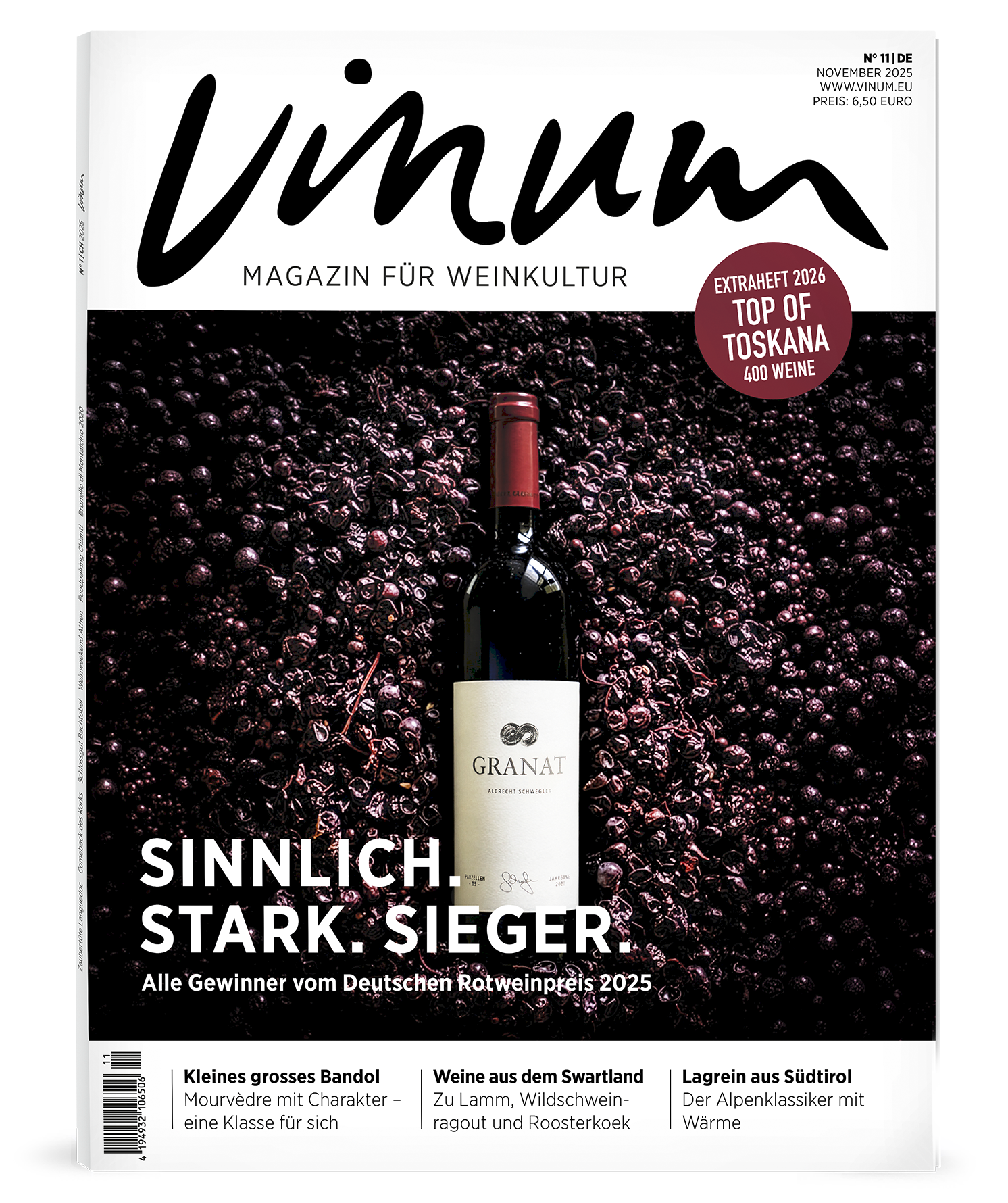 Einzelausgabe Aktuelle VINUM Ausgabe jetzt bestellen für 6,50 Euro (zzgl. 1,30 Euro Versandkosten) Bestellen Sie sich die aktuelle Ausgabe bequem zu Ihnen nach Hause und tauchen Sie ein, in die faszinierende Welt des Weins. (nur für Lieferungen innerhalb DE erhältlich) Bester Weinjournalismus | Unabhängige Bewertungen | Mitreissenden Reportagen | Fundiertes Wissen | Reisetipps & Foodpairings Freuen Sie sich auf: Spannenden Weinjournalismus Unabhängige Bewertungen Mitreissende Reportagen Fundiertes Wissen Köstliche Foodpairings Inspirierende Reisetipps Highlights in der aktuellen Ausgabe: Deutscher Rotweinpreis: Die Kategoriensieger 2025 Extraheft Top of Toskana: 400 Weine Lagrein aus Südtirol: Der Alpenklassiker mit Wärme Weine aus dem Swartland: Zu Lamm, Wildschweinragout und Roosterkoek Weinweekend: Verona Magisches Bandol: Die zweite Heimat des Mourvèdre Winzerlegende: Chris und Andrea Mullineux, Südafrika Lesen Sie außerdem über neue Trends, inspirierende Winzerporträts und aktuelle Empfehlungen für genussvolle Momente. Sie wollen VINUM kennenlernen? Hier gehts zum VINUM Probeabo - 3 VINUM Ausgaben für nur 15 Euro! Rechnungsanschrift Firmenname Anrede* Herr Frau Titel Nachname* Vorname* Strasse/Nr.* PLZ* Ort* Land* Deutschland Geburtsdatum* E-Mail* Telefon Mobil Abweichende Lieferadresse Lieferanschrift Firmenname Anrede* Herr Frau Titel Nachname* Vorname* Strasse/Nr.* PLZ* Ort* Land* Deutschland Telefon E-Mail Mobil Zahlungsinformationen Rechnung Bankeinzug Kontoinhaber IBAN* BIC* SEPA-Lastschriftmandat: Ich ermächtige den Verlag Zahlungen von meinem Konto mittels Lastschrift einzuziehen. Zugleich weise ich mein Kreditinstitut an, die vom Verlag auf mein Konto gezogenen Lastschriften einzulösen. Hinweis: Ich kann innerhalb von acht Wochen, beginnend mit dem Belastungsdatum, die Erstattung des belasteten Betrages verlangen. Es gelten dabei die mit meinem Kreditinstitut vereinbarten Bedingungen. Zahlungsrythmus: jährlich Ihre Mitteilung an uns Ja, ich will von weiteren Vorteilen profitieren und bin damit einverstanden, dass ich unverbindliche Angebote des Verlags Intervinum AG zu Abonnements, Büchern, Accessoires, Online-Produkten, Veranstaltungen und dem Wine Trade Club per E-Mail übermittelt bekomme. Mein Einverständnis hierzu kann ich jederzeit widerrufen (z. B. per E-Mail an info@vinum.ch). Zudem nehme ich zur Kenntnis, dass damit Daten von mir gespeichert werden und akzeptiere die Datenschutzbestimmungen. Ja, ich akzeptiere die Allgemeinen Geschäftsbedingungen und Hinweise zum Widerrufsrecht.* Ich bin mehr als 18 Jahre alt* Mit der Anmeldung werden die Daten aus der Eingabemaske an uns übermittelt. Zudem werden die IP-Adresse des Nutzers sowie Datum und Uhrzeit der Anmeldung gespeichert. Für weitere Informationen verweisen wir auf unsere Datenschutzerklärung. kaufen Mit * markierte Felder sind Pflichtfelder