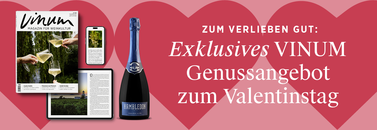 Passend zum Tag der Liebe bietet VINUM Ihnen ein unwiderstehliches Angebot: Das VINUM Jahresabo + 1 Schaumwein aus Englands ältestem kommerziellen Weingut. Diesen Schaumwein erhalten Sie in Deutschland exklusiv nur mit diesem Angebot!