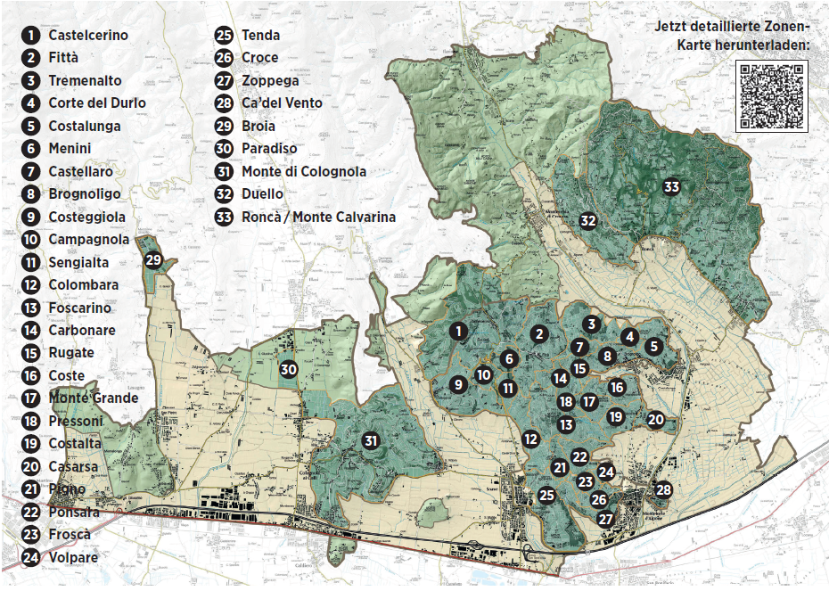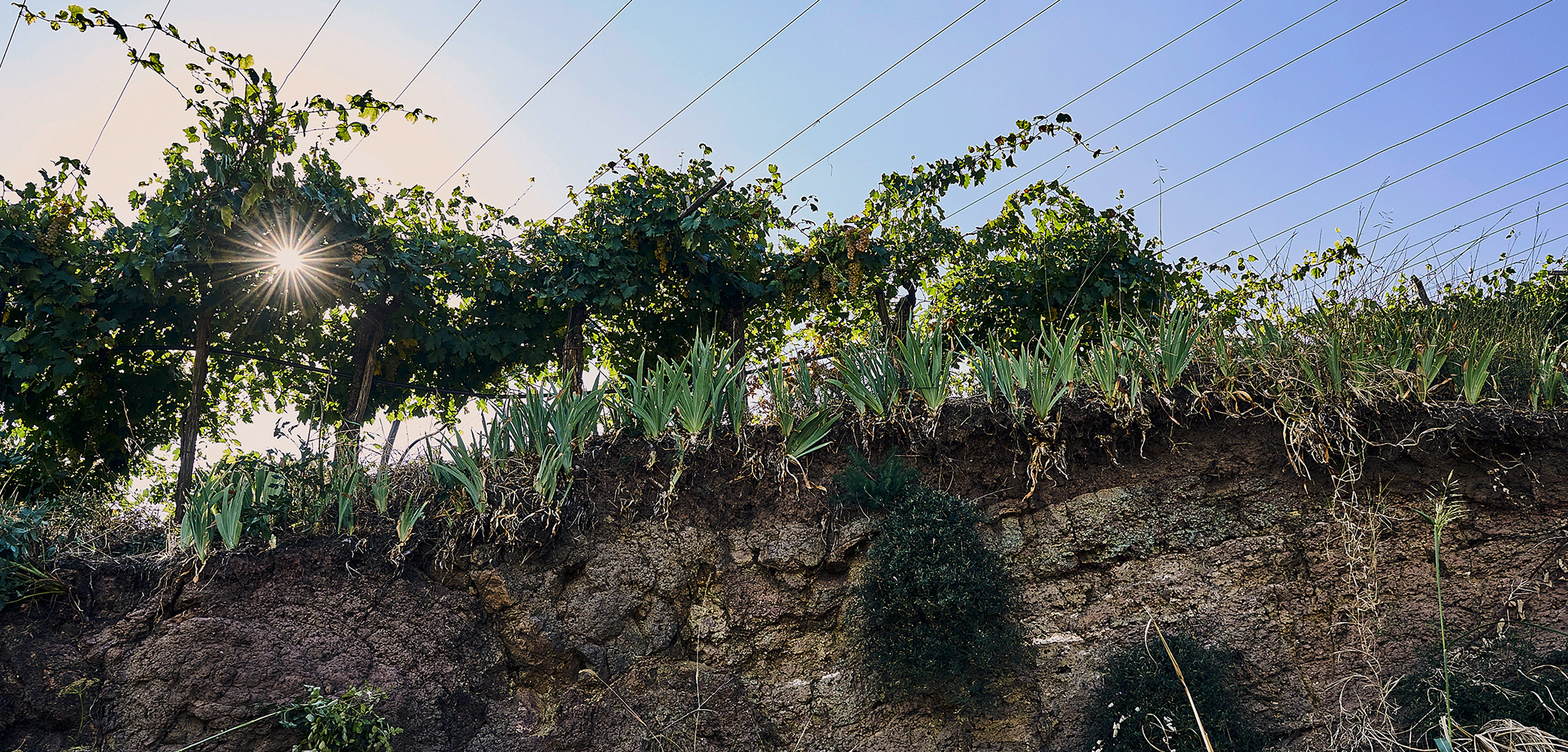 Die 33 UGA unterteilen sich in zwei grosse Zonen, die Lagen mit vulkanischen Böden (vorwiegend in der zentralen Classico-Zone und im Osten des Anbaugebietes) und die Weinberge mit vorwiegend kalkdominierten Böden. Allen 33 UGA ist gemein, dass sie ausschliesslich in den Hügeln des Soave zu finden sind und nicht in der Ebene. Wir beginnen unsere Reise zu den UGA im Herzen des Soave Classico mit seinem Mix aus Vulkangestein und Kalk und entdecken dann das vulkanische Terroir im Osten, machen nochmals einen Abstecher auf kalkhaltigen Untergrund zu Füssen der Monti Lessini, bis wir zum Monte Calvarina mit seinen Vulkanböden gelangen.