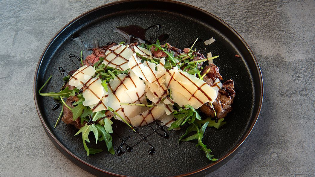 - Das Fleisch mit einem scharfen Messer in ca. 1 cm breite Streifen schneiden und auf einer heissen Platte anrichten. Mit Fleur de Sel und frisch gemahlenem Pfeffer würzen. Den Rucola und die Parmesansplitter darübergeben. Die Sauce aus der Pfanne durch ein Sieb streichen und über die Tagliata träufeln.