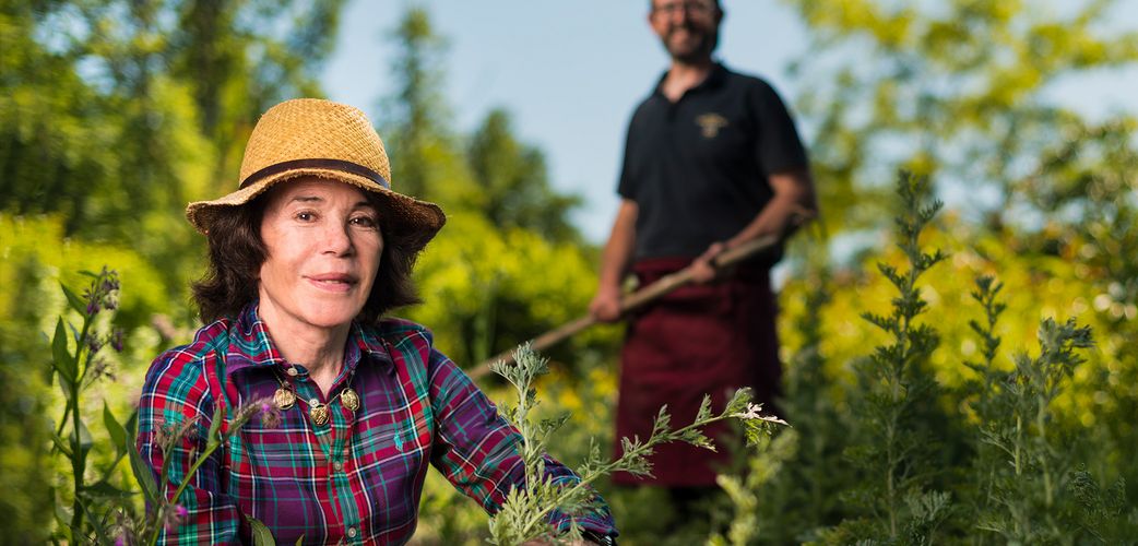 • Ernte im gutseigenen Kräutergarten: Besitzerin Florence Cathiard mit Rebmeister Nicolas Poumeyreau.