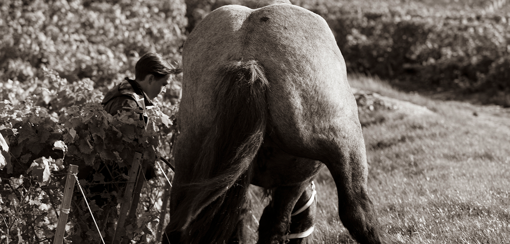 Denkste! Kaum war Capucine in den Reben, zog sie am Strick und in Richtung frisches, grünes Gras, auf das sie den ganzen, trockenen Sommer über verzichten musste. Die Fotosession interessierte sie wenig. Doch sie ist gut erzogen und gehorcht der Meisterin aufs Wort. Darum akzeptierte sie schliesslich gutwillig, die Arbeit in den Reben aufzunehmen. Den feuchten Steilhang in Le Mesnil nahm sie mit links und so schnell, dass ich erst einmal daneben traf.