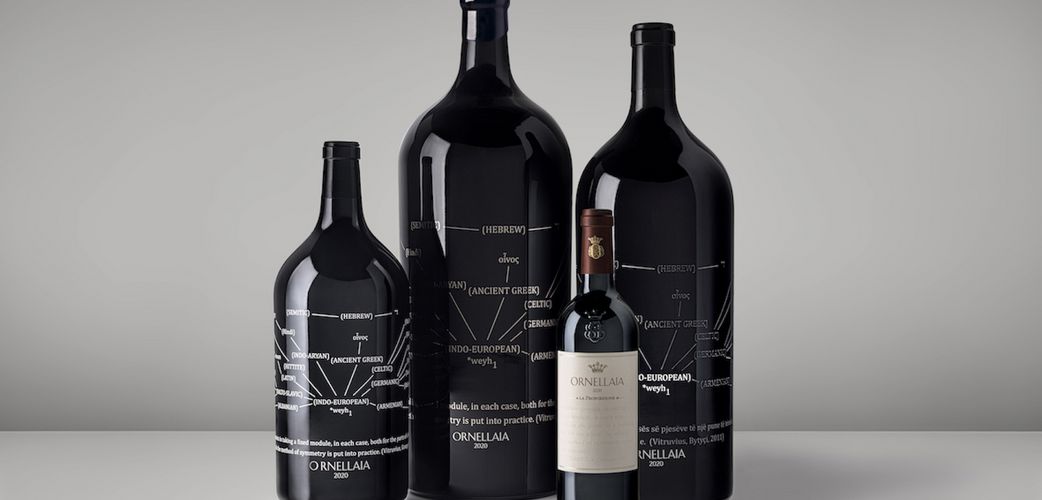 Auf dem Vendemmia d’Artista-Etikett einer 750-ml-Flasche, das jeweils auf einer Flasche in einer 6er-Kiste zu finden ist, ist ein Zitat von Vitruv (De architectura 3.1.3) in englischer Sprache auf Papier eingraviert. Bei den 100 Doppelmagnum-Exemplaren ist der etymologische Stammbaum des Wortes Vino als Relief auf der Flasche platziert; während bei den 10 Imperial-Flaschen, alle unterschiedlich, der etymologische Baum in das Glas eingraviert wurde. Ein einzelner Zweig ist weiss hervorgehoben und das Zitat von Vitruv in die hervorgehobene Sprache oder eine ihrer modernen Nachfolger übersetzt: Albanisch, Serbokroatisch, Latein, Italienisch, Hindi, Hebräisch, Neugriechisch, Irisch, Deutsch und Armenisch. Für die einzige Salmanazar sind der etymologische Baum und das darunter stehende Zitat von Vitruv auf Englisch. Das auf der Flasche angebrachte Relief ist aus Platin.