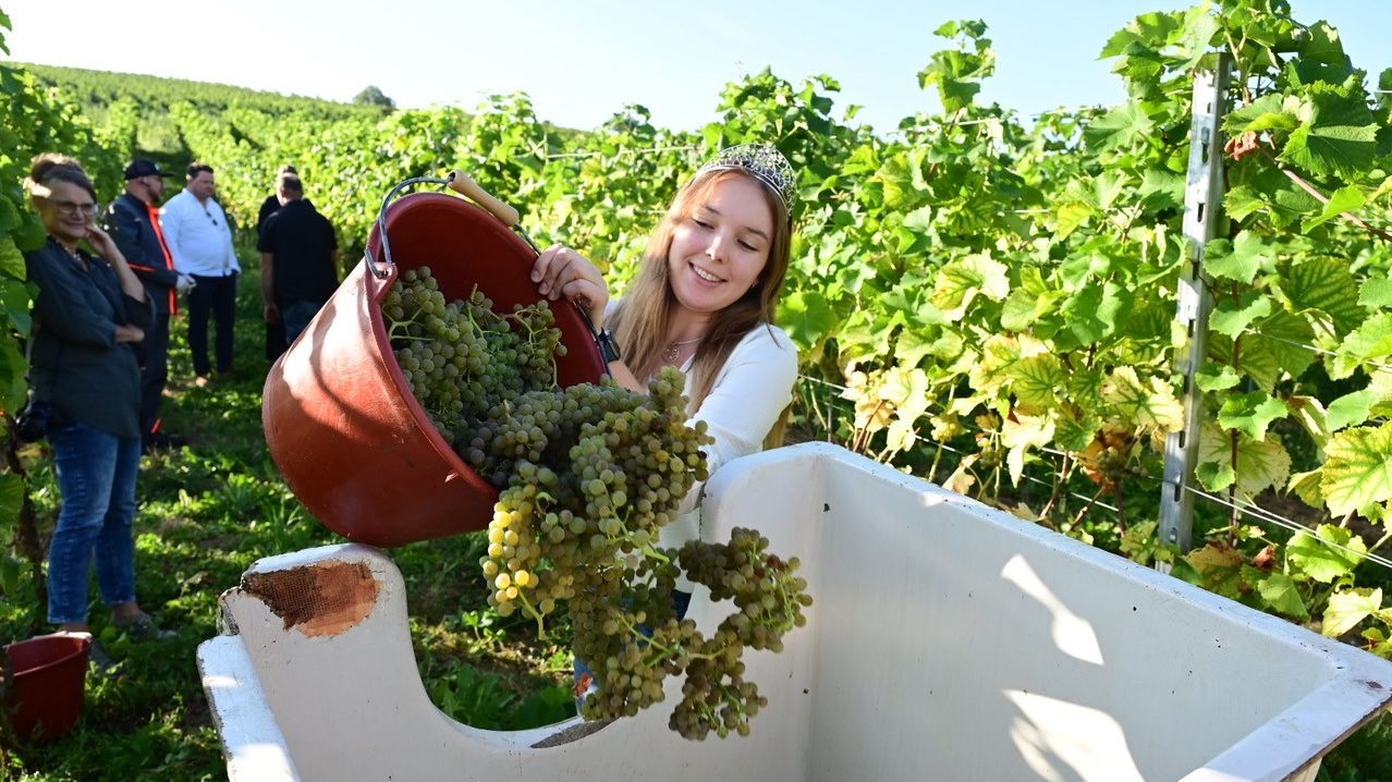 In Baden, dem wärmsten Anbaugebiet Deutschlands, stand am Montag auch Weinkönigin Tina Glur im Weinberg, um Trauben der weissen Piwi-Sorte Solaris zu ernten. Im Grunerner Altenberg hatten diese bereits ein Mostgewicht von 92 Grad Oechsle erreicht.