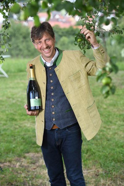 Begonnen hat alles 1993, als Geiger den Gasthof «Lamm» von seinen Eltern übernahm. Der gelernte Koch und Betriebswirt hatte damals Zugriff auf vier Hektar Obst, das schon der Vater verarbeitet hatte, auch für Brände. 1997 wagte sich der junge Wirt nach dem Vorbild vom Grossvater an einige hundert Flaschen Schaumwein im klassischen Verfahren mit dem Saft aus der Champagner-Birne, erzeugt in einem Teil des Gasthauses, in dem heute reichlich Barrique-Fässer liegen, in denen andere Produkte reifen. Der Versuch klappte, eine Anregung, mit Wiesenobst voll durchzustarten. 2003 gründete er seine Manufaktur als Alleingänger. Inzwischen hat er drei Standorte, 30 Mitarbeiter, und eine grosse, funktionsgerechte Kellerei, die zum Beispiel auch ein Laufband vorweisen kann und in der Äpfel und Birnen nach Reifestadium per Hand sortiert werden.