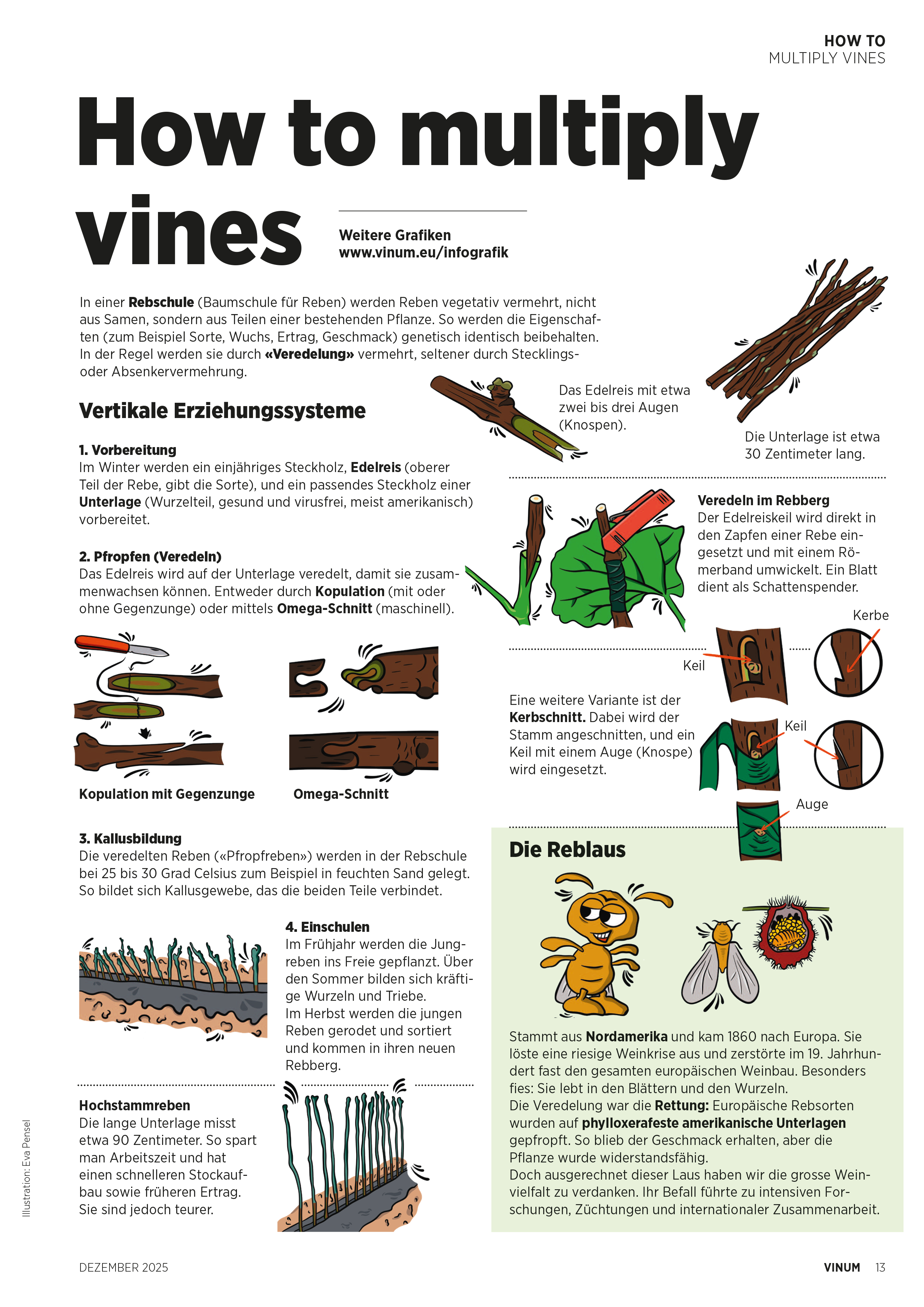 Stand: Dezember 2025How to multiply vinesHier finden Sie die Infografik als PDF. Das könnte Sie auch interessieren Stand: November 2025 Cool Climate Von «Cool Climate»-Weinregionen spricht man, wenn die Temperaturen während der Vegetationsperiode niedriger sind. Typische Vertreter: Riesling, Chardonnay, Pinot… Stand: Oktober 2025 All about Terroir «Terroir» leitet sich vom lateinischen Wort «terra» (= Erde) ab und bezeichnet das landwirtschaftliche Potenzial eines Gebiets. Also wie Boden, Klima und Landschaft… Stand: September 2025 How tannins work Tannine sind pflanzliche Gerbstoffe, also Flavonoide und Polyphenole. Sie sind adstringierend! Sie erzeugen ein pelziges, trockenes Mundgefühl auf der Zunge.… Stand: Juli/August 2025 How to make Chaptalisierung Die Chaptalisierung dient der Erhöhung des Alkoholgehaltes durch die Zugabe von Zucker zum Traubensaft vor bzw. während der Gärung. Diese kellertechnische Massnahme… Stund: Juni 2025 How to make Reberziehung Die Rebe ist eine Kletterpflanze (Liane), die sich ohne Kletterhilfe oder Träger nicht aufrecht halten kann. Daher gibt es Unterstützungshilfen, wie Pfähle (Stickel)… Stand: April 2025 Sprechen Sie Wein? Nach welchen Kriterien wird ein Wein bewertet? Wir erklären es Ihnen. Zurück zur Übersicht