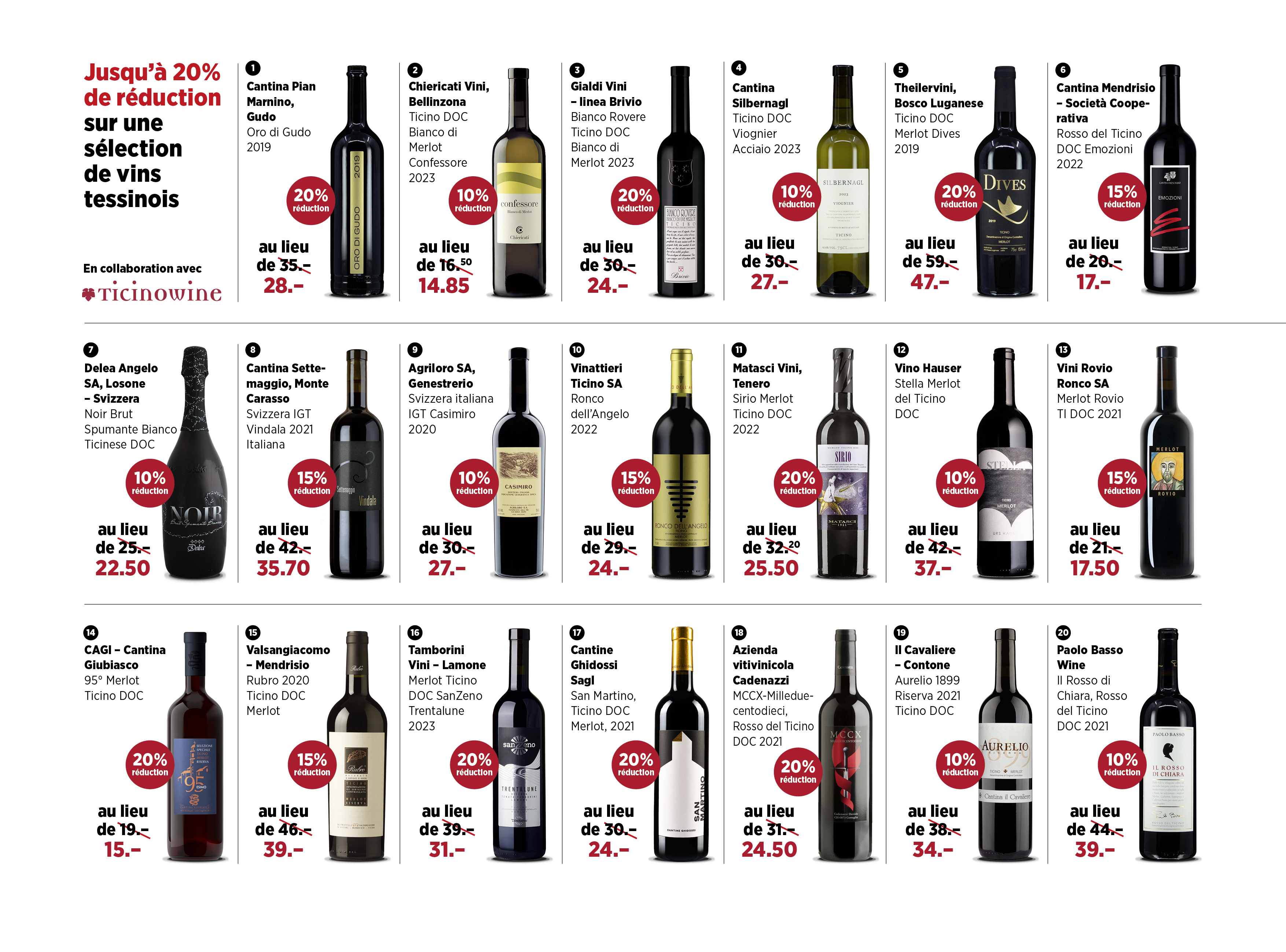 Vous avez maintenant l'occasion unique d'acheter vos vins préférés parmi une sélection de 20 bouteilles de vins tessinois à un prix imbattable. Profitez d'une réduction allant jusqu'à 20 %.