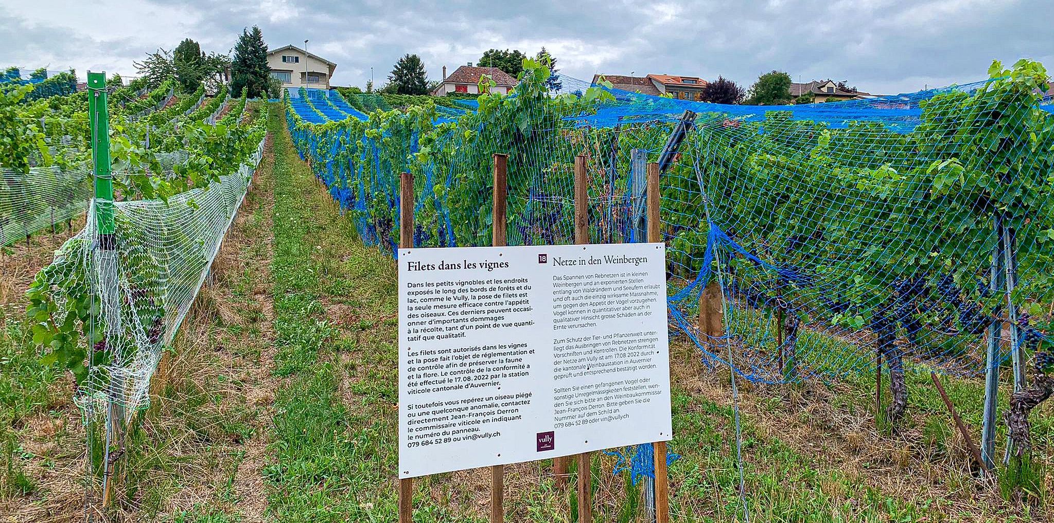 L’Interprofession des Vins du Vully (AIVV), en collaboration avec VITISWISS (Fédération suisse pour le développement d’une vitiviniculture durable) et Birdlife (Association suisse pour la protection des oiseaux), innove afin de protéger les raisins des ravageurs, en minimisant les risques pour les animaux. D’ici la fin de cette semaine, 20 panneaux seront posés aux quatre coins du vignoble du Vully. Leur but : informer le public du bien-fondé des filets et les impliquer en leur indiquant quoi faire s’ils se trouvent en présence d’un oiseau piégé.
